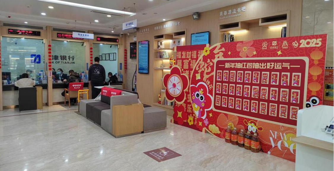 为营造喜庆祥和的春节氛围,天津银行营业网点以“中国红”为主色调,融合蛇年元素和天津银行元素,通过张贴福字和窗花、吊旗、悬挂红色灯笼和中国结挂饰、摆放寓意吉祥的蛇年醒狮生肖玩偶等进行特色化装饰,网点穿“新衣”,厅堂换“新貌”,营造了浓厚的喜庆、温馨的服务环境,节日氛围扑面而来。部分厅堂网点还设置了“红包墙”开展新春厅堂重点业务互动活动,让广大客户在办理业务的同时又能参与活动,感受春节喜气。