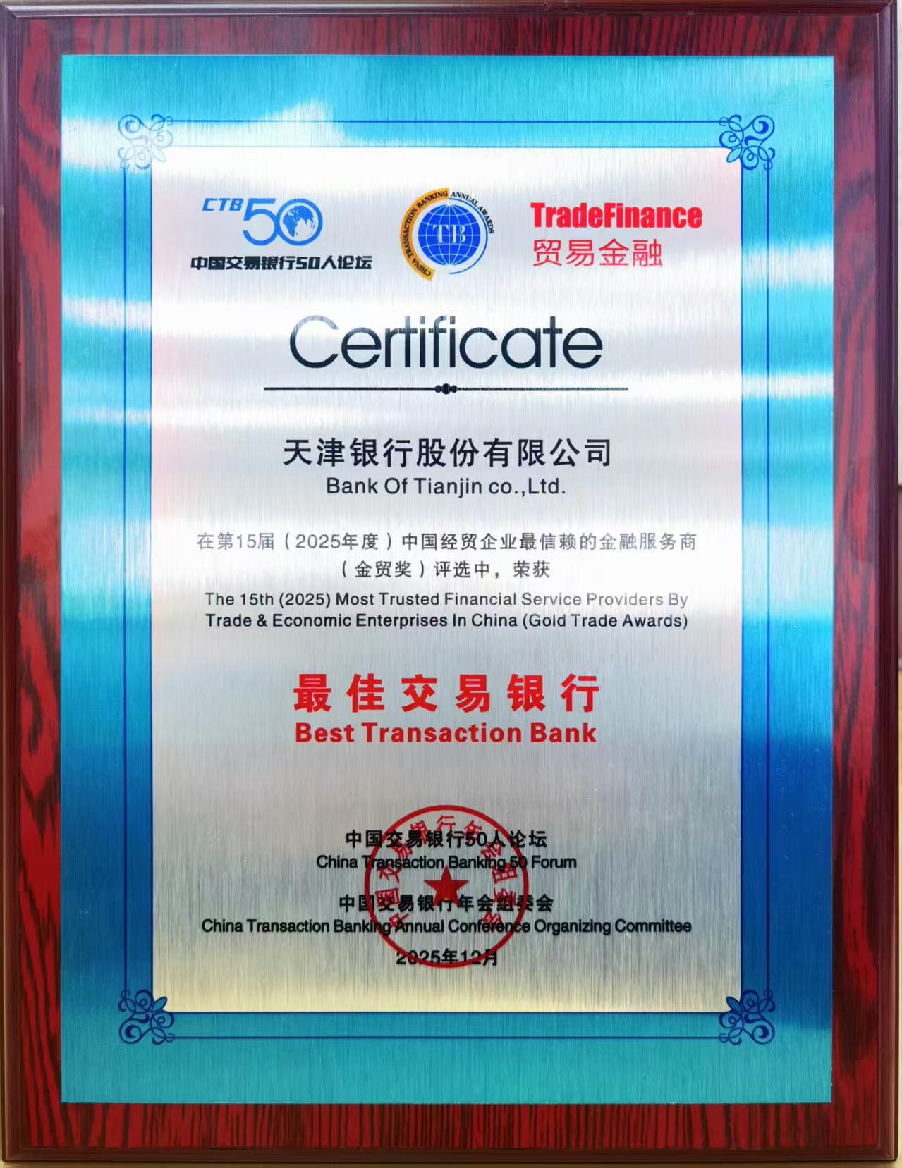 日前,第十届中国交易银行年会暨第15届中国经贸企业最具信赖的金融服务商“金贸奖”颁奖典礼上,天津银行凭借卓越的交易银行综合服务能力与创新实践,一举摘得金贸奖“最佳交易银行”奖项。
